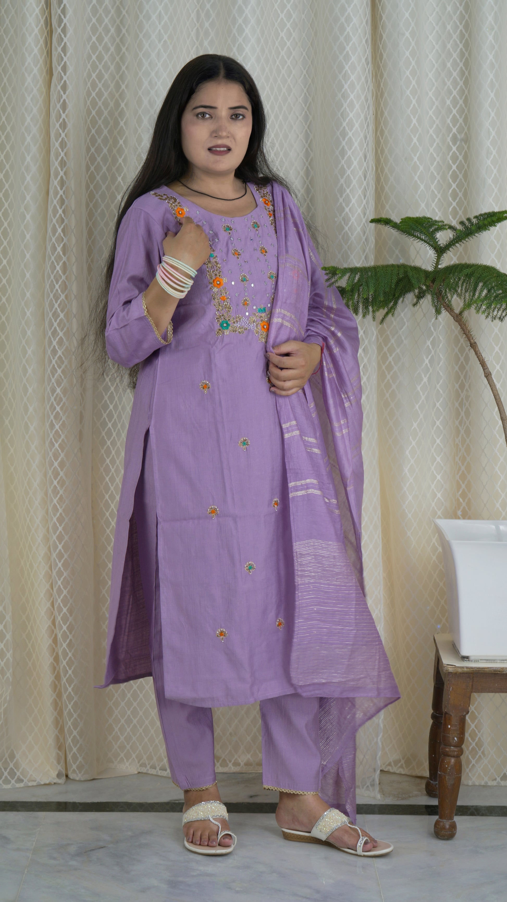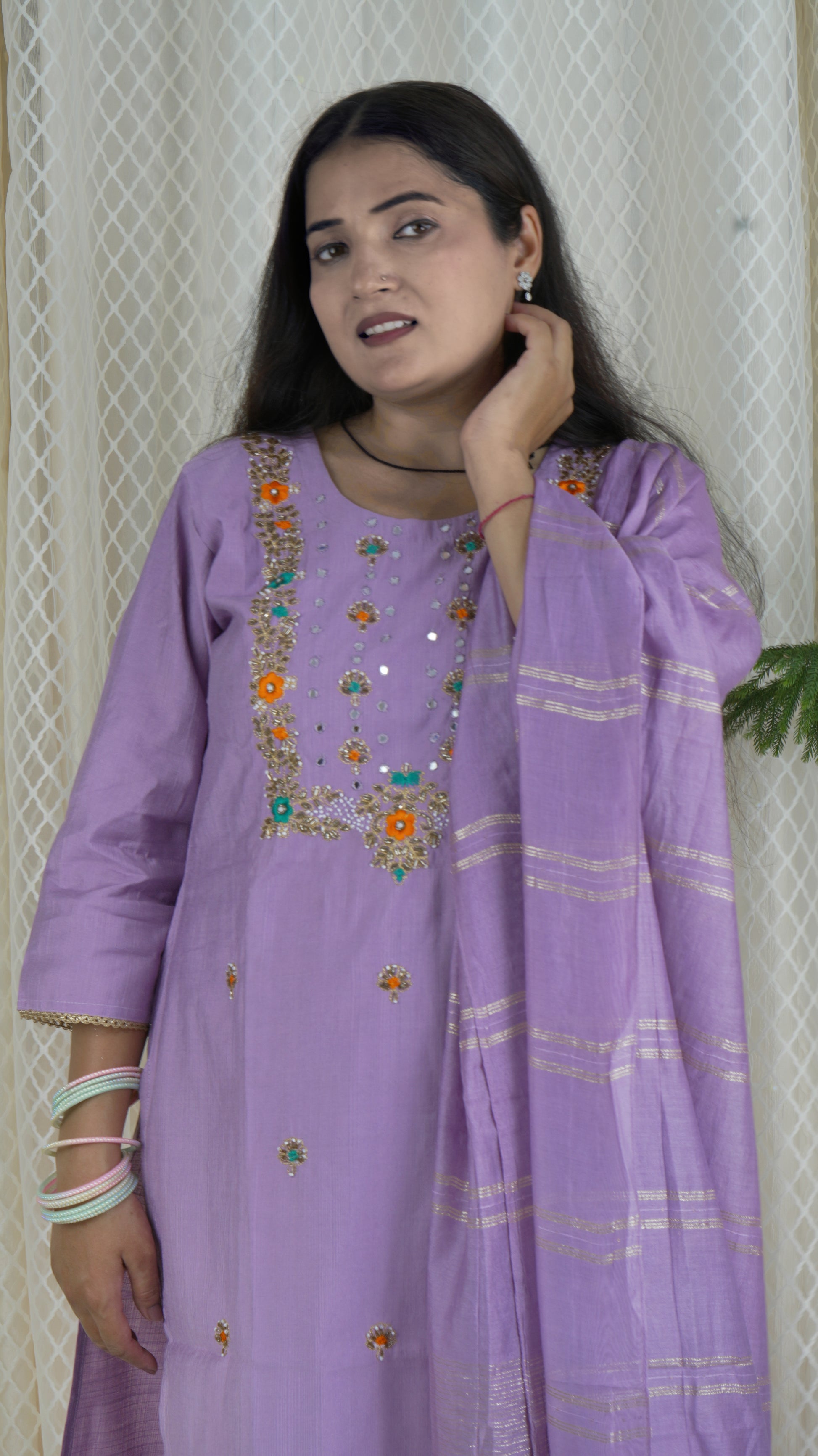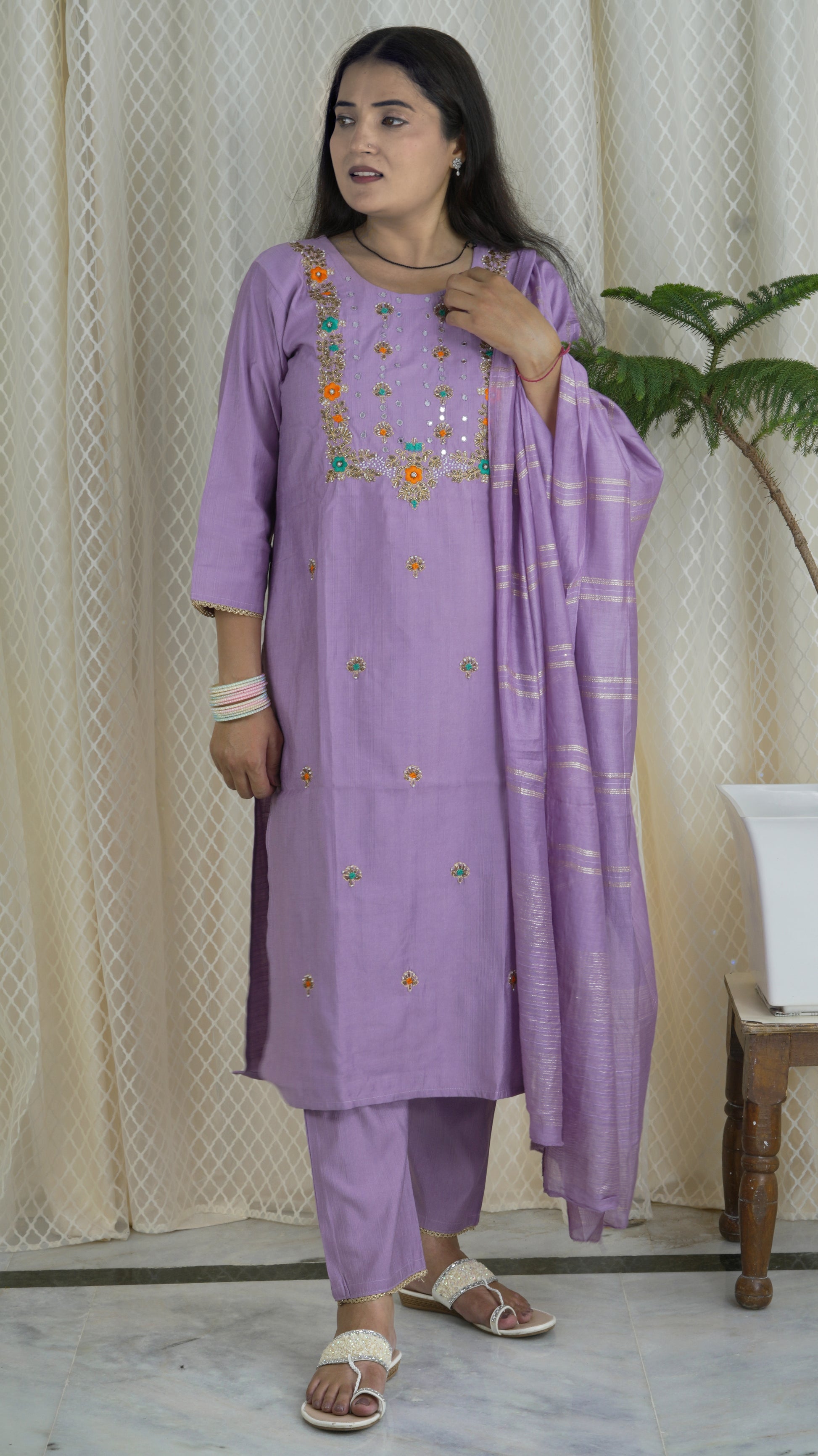 Bring a touch of freshness to your wardrobe with this graceful lavender kurta set, beautifully designed with delicate embroidery and a soft, coordinated dupatta. The subtle color paired with vibrant floral handwork makes it perfect for festive occasions as well as casual gatherings.